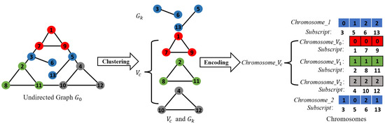 In this paper, a gene represents a node in a graph or an electronic component in a circuit. Each gene has two important parameters: value and subscript. The value of the gene represents which subset the node belongs to, and the subscript corresponds to the mark of the node with the range of values [0, k − 1]. For the output of the clustering algorithm, minimum graph and cluster set , there are different encoding rules, as follows: