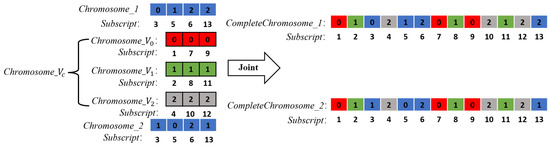 Schematic diagram of the Joint function. Chromosome_1 and Chromosome_2 represent two short chromosomes in the current population, P_size = 2, and set , , and are three clusters identified by the clustering algorithm. This function joins the absolute genetic genes with short chromosomes Chromosome_1 and Chromosome_2 and outputs two complete chromosomes CompleteChromosome_1, CompleteChromosome_2.