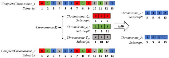 For the ith complete chromosome CompleteChromosome_i, all absolute genetic genes in this chromosome are deleted through subscripts stored in , where . In detail, for any gene in CompleteChromosome_i, if its subscript is same as a node mark in , then it is deleted. The function outputs P_size short chromosomes, which is the next generation population, and these are used as input to start the next round of genetic evolution. This operation can reduce the solution space of the overall genetic algorithm and effectively improve the computing efficiency.