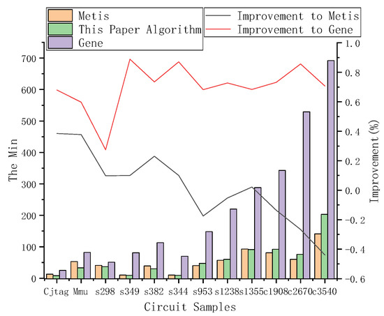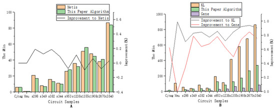 According to Table 3, the proposed algorithm obtained the best result (Min) 9 times in 12 circuit samples, and the best performance can be improved by up to 19.05%. In Figure 9A, the polyline is generally above the zero-dot line, and is improved by an average of 4.57% compared with Metis. The above experimental results show that compared with the Metis algorithm, the proposed algorithm exhibits a good advantage in finding the Min. On the other hand, the stability of the proposed algorithm (Avg) is weaker than that of Metis, which is related to the random crossover and mutation of the genetic algorithm, so the proposed algorithm must be carried out multiple times to obtain the optimal results.