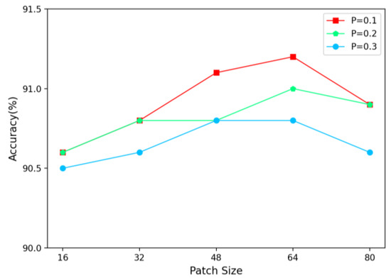 In addition, we also evaluated the effect of the values of different parameters (, ) on the experimental results. In Figure 4, the horizontal coordinate represents the value of the parameter (the size of each patch), the vertical coordinate is the accuracy rate, and the different colored lines indicate the size of the probability parameter . As increases in a certain range, the area covered by each patch on the original image also becomes larger, allowing the network to better discover additional discriminative regions, thus gradually improving its performance. When is low, patches may not cover important areas well, and may even negatively affect the network’s performance. When remains constant, a larger value results in more patches, and more areas being covered up. Only a proper number and size of patches can strengthen the classification ability of the network, as too many or too few patches can have negative impacts. Therefore, by the experimental results, the value is set to 0.1 and is 64.