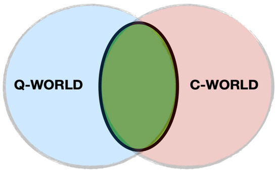 Relation between the quantum and the classical worlds. The classical world is not contained in a larger and more fundamental quantum world. Instead, there is only an overlap between the two worlds. In the picture, the cyan quantum world (Q-world) overlaps with the light orange classical world (C-world), and the green area represents their intersection.