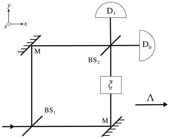 The Mach–Zehnder interferometer (MZI): an incoming electron reaches a beam-splitter (BS1) which puts it into a superposition of paths. Upon reflection in the mirrors (M) and recombination in the second beam-splitter (BS2), the probability of detection in either detectors D0 or D1 is dictated by the relative phase . Furthermore, depicted is the direction of the boost .