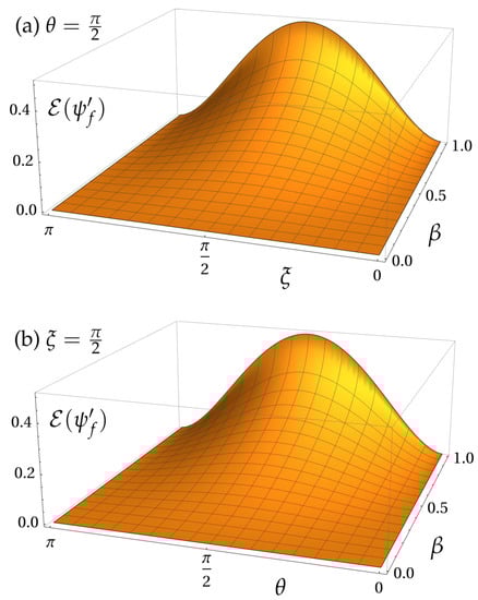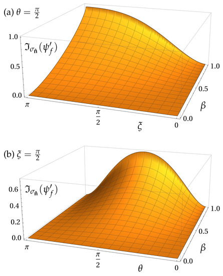 Figure 3 shows the plot of this expression for the same regimes of parameters we used for entanglement in Figure 2. The dependence on shows the same behavior observed for that case: eigenstates are unaffected by the Wigner rotation due to the specific geometric configuration considered here. The dependence on is more interesting: while entanglement is maximized for and is zero for , the irreality of is maximal for , when only the vertical detector D1 is reached with probability 1. Since no correlations are present, all of the irreality, in this case, is due to -coherence being generated by the rotation. In fact, for the relative entropy of coherence , the term evaluates to the same expression (19), such that when there is no entanglement, that is, , the spin irreality is fully attributed to coherence. This is further confirmed by computing , the one-way quantum discord associated with , and verifying that it is exactly equal to entanglement [Equation (17)]. Thus, in this particular case of a pure state, the irreality of is the sum of entanglement and -coherence, each of these portions being affected differently by the Wigner rotation. This result shows that quantum irreality may increase with a Lorentz boost even in scenarios where entanglement remains unaffected.