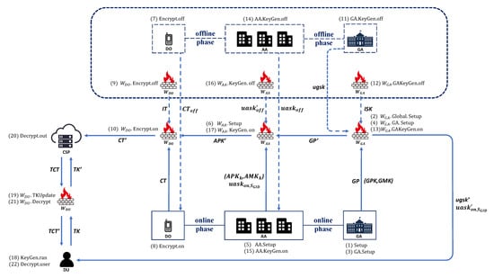 - Shao, J.; Zhu, Y.; Ji, Q. Privacy-preserving online/offline and outsourced multi-authority attribute-based encryption. In Proceedings of the 2017 IEEE/ACIS 16th International Conference on Computer and Information Science (ICIS), Wuhan, China, 24–26 May 2017; pp. 285–291. [Google Scholar]