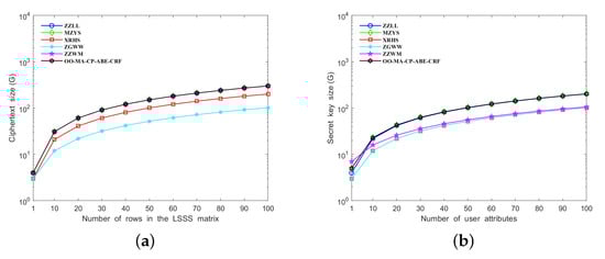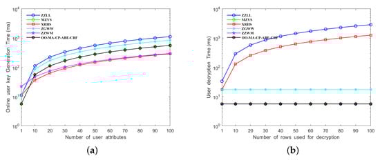 - In order to make the scheme suitable for IoT, we have adopted online/offline key generation, online/offline encryption, and outsourcing decryption technologies to improve the computational efficiency of the scheme. These technologies are not only adopted by users and attribute authority but also by the four CRFs, which can significantly improve the efficiency of the scheme. Compared with other studies in terms of computational and storage overhead, our scheme has obvious advantages.