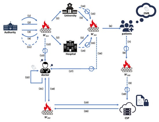 As shown in Figure 1, the scheme includes five participants and corresponding reverse firewalls. They are the global identity authority (GA), attribute authorities (AA), the cloud service provider (CSP), the data owner (DO) and the data user (DU). Among them, the CRF of GA is , the CRF of AA is , the CRF of DO is , and the CRF of DU is .