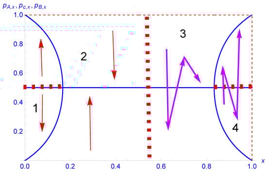 - Region 1 lies within the range , featuring tipping point dynamics with being the tipping point. The initial majority is increased by the repeated cycles of local discussions with a monotonic convergence towards the relevant attractor, either when or when . In the first case, A wins the public debate or the related vote but loses in the second case. In both cases, a core minority B (A) subsists against the majority A (B). The two attractors move towards each other with increasing x towards .