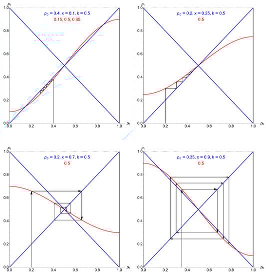 After one cycle of updates, agents are reshuffled and distributed again randomly in groups of size four, leading to a proportion obtained from Equation (1) applied to . Repeating the process yields a tipping point dynamic, as seen by solving the fixed point equation , which yields two attractors and separated by a tipping point in between located at .