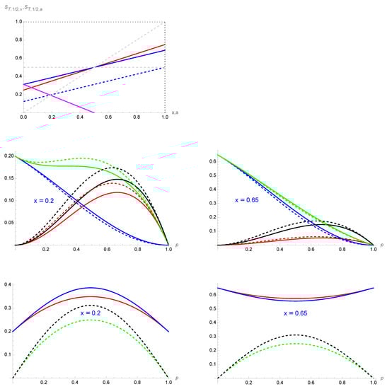 To label the nature of the polarized state at the attractor, I evaluate the total proportion of shifts at as a function of x. From Equation (10), the associated proportions of individual shifts are and . It yields 0.388 and 0.556 for and , respectively. The attractor is thus marked by a significant proportion of individual shifts between A and B. Despite the division of the community into two opposite halves, the high fluidity between the groups prevents the setting of hate between them. On this basis, I label that polarization as coexistence. The associated entropy is high.
