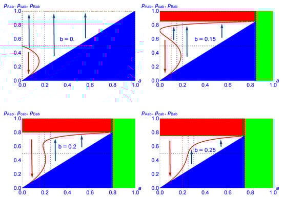 Attractors and tipping points as a function of a for a given b from Equation (12). Four cases are exhibited with , , , and .