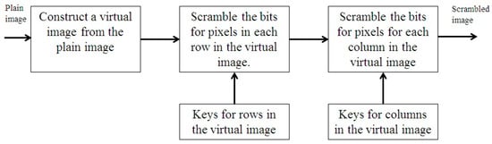 As the first step of the scrambling process, a virtual image is generated from , where is a given integer that satisfies and holds for p. is obtained from by a mapping that associates each pixel in with a pixel in . Specifically, for each pair of integers where and hold, maps the pixel in the th row and th column in to a pixel in row and column in , where and are determined based on Equations (1) and (2).
