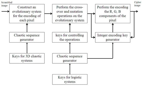 Figure 2 shows the steps followed by the proposed approach to encode the R, G and B components of pixels in a scrambled image. For each pixel, an evolutionary system is constructed from the outputs of a set of 3D chaotic systems. The integers in the evolutionary system are then varied by a number of cross-over and mutation operations controlled by a set of one-dimensional logistic systems. Finally, an integer is selected for each component of the pixel from the integers in the evolutionary system and the component is encoded by an integer key computed from the selected integer.