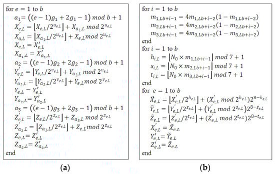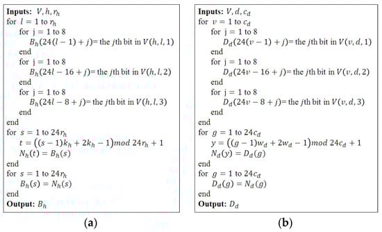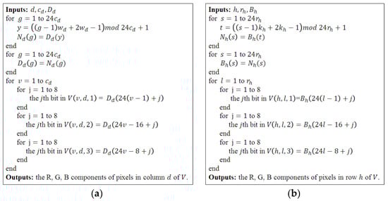 Figure 4a shows the pseudocode for recovering the binary bits in column of the virtual image. For each integer such that holds, an integer is determined from and using Equation (8). The location of is changed to position in . After the locations of all bits in are changed, is used to reset the R, G and B components of pixels in column of . For each integer that satisfies , is set to be the value of the binary bits from positions through to in , is set to be the value of the binary bits from positions through to in and is set to be the value of the binary bits from positions through to in .
