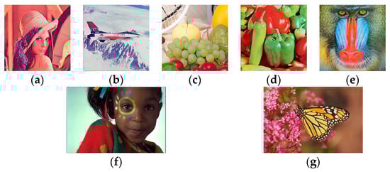 A computer program has been created to implement the proposed approach in MATLAB and its encryption security has been analyzed based on the cipher images generated for seven benchmark images and 100 color images selected from the BSD500 dataset []. In addition, a comparison of the proposed approach with several state-of-the-art encryption methods is performed based on a number of security measures. Other approaches tested for comparison are the methods proposed in [,,,,,,,,,,]. In the testing, an evolutionary system that contains five 3D chaotic systems is constructed to encode pixels in a scrambled image. A value of is chosen for integers , , and .
