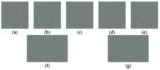 The Peak Signal Noise Ratio (PSNR) provides a measure for the difference between a cipher image and its plain image. A higher PSNR value thus often suggests higher security for a cipher image []. The PSNR for a cipher image is calculated based on its plain color image with Equations (40) and (41).