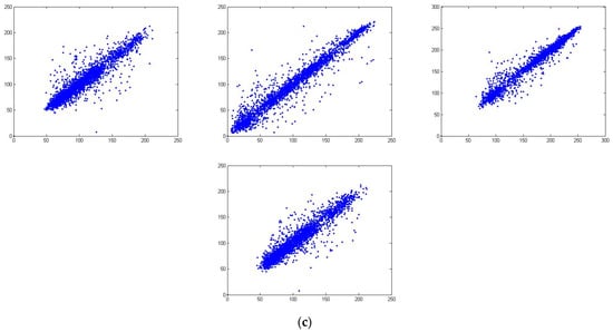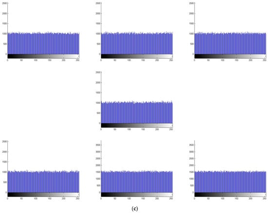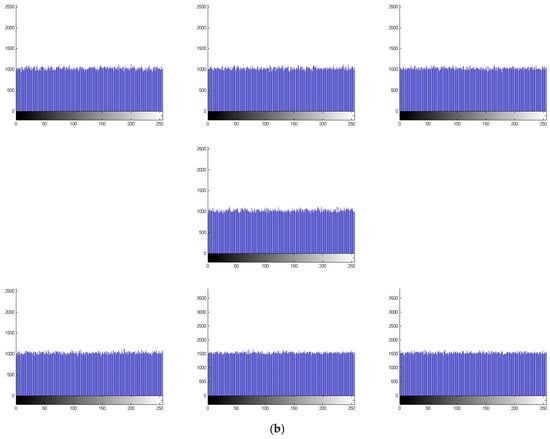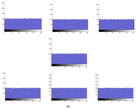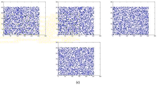 Equations (31)–(33) show that the encryption keys , and are dependent on the encrypted image contents associated with the pixel in row and column . This fact suggests that the proposed approach is plain-image-sensitive. In practice, the security of encryption can be further enhanced by applying the encoding process multiple times.
