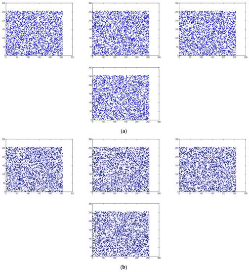 where is a large positive integer and , and are the th elements in the chaotic number sequences generated from Equation (15) with , and as the initial values, respectively.