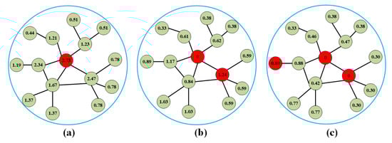Next, we will illustrate the neighbor spread centrality attenuation method. As shown in the initial state of Figure 2a, the maximum node spread centrality value is 2.73, so this node is marked as a preselected influential node. In the second round of spread centrality value updates, as shown in Figure 2b, the value of the preselected influential node in the previous round is reset to 0, the spread centrality of its neighbor nodes is attenuated to half of the original value, and the second-order neighbor nodes are attenuated to the original value of . Then, the node with the largest spread centrality value in the network is preselected as the second influential node. By following this process, non-neighbor nodes will be preselected as influential nodes after the third round of node spread centrality value updates, which effectively reduces the coincidence of spread influence of influential nodes, as shown in Figure 2c.