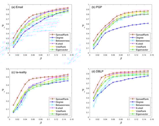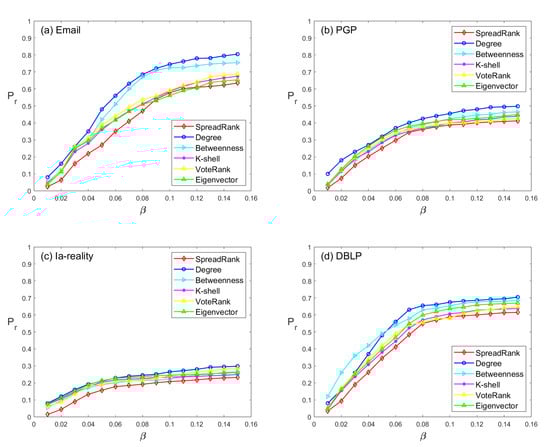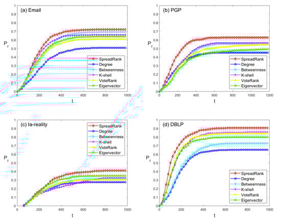 The basic statistical information of the four real datasets used in this study is presented in Table 2. It can be observed that the real networks differ significantly in terms of node size, average degree, clustering coefficient, and average distance of the shortest path, and these parameters have a certain impact on the information spread [12,13,16,17,18]. The selection of networks with different parameters ensures the generalizability of the proposed SpreadRank method. The email network is the smallest in size, but it has a high clustering coefficient and average degree, indicating that the nodes are closely interconnected. In contrast, the DBLP network is the largest in size, while the PGP network is a server–host network with a relatively sparse node distribution, resulting in a lower clustering coefficient. Furthermore, the Ia-reality network is a sparsely connected network with a low average degree, which is in contrast to the email network.