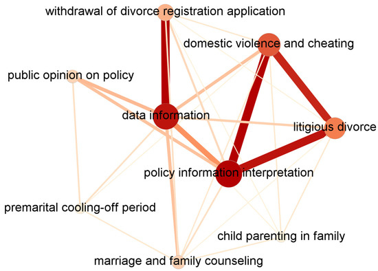 Figure 3 and Table 4 show the public agenda network from January to May 2021, in which “public opinion on policy”, “data information”, “policy information interpretation”, and “domestic violence and cheating” are the four core issues. Among them, the first two issues had a greater bridging capability in PANs and stronger links with other issues. The links between “public opinion on policy” and “data information”, “premarital cooling-off period”, and “domestic violence cheating” are thicker, indicating that these three groups of issues are closely linked together. Moreover, the importance of the “premarital cooling-off period” issue increased in PANs, reflecting the public’s call for implementing a premarital cooling-off period policy rather than the divorce cooling-off period policy.