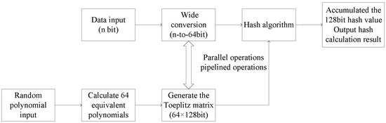 In the existing FPGA implementation scheme of the hashing algorithm, first, the FPGA transforms the data to be computed via FIFO. At each clock cycle of the FPGA, 64-bit data are read from the FIFO. At the same time, according to the set characteristic polynomial, a Toeplitz matrix is generated to calculate the 64-bit data. In the case where the high 64-bit coefficients of the characteristic polynomial are all zero, all the computations can be performed in a single cycle, and the data can be processed in parallel in the form of a pipeline for real-time processing effects [13,14,15,16,17].