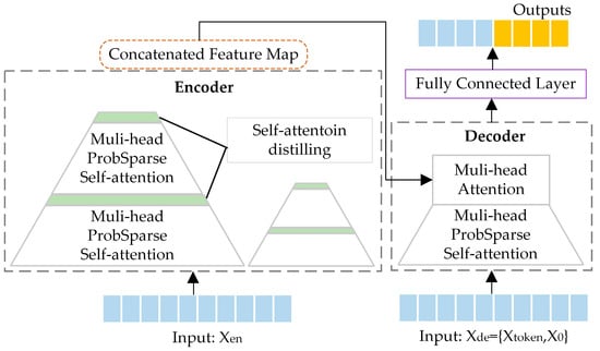 The Informer network is a variant of the Transformer that effectively addresses the long-sequence prediction problem []. Improvements of the Informer include: using a probsparse self-attention mechanism to reduce the complexity of matrix computation; introducing a self-attention distillation mechanism to extract the main features of time series, which effectively reduces memory usage; using a decoder to directly output the predicted values generatively to achieve the purpose of long-series prediction. The structure of the Informer model is shown in Figure 1.