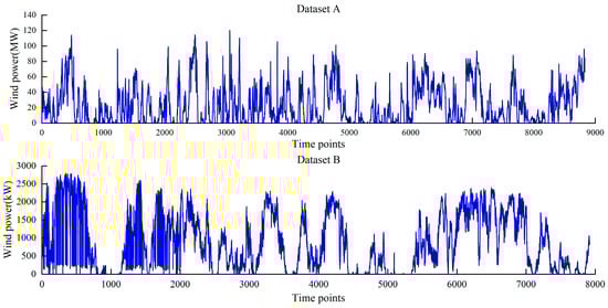 The experiments are mainly conducted on two complete datasets without missing values in this paper. Dataset A is based on a wind farm in Gansu, China, which was selected from 1 July to 30 September 2019, with a sampling interval of 15 min. Dataset A contains wind power, wind speeds at different heights (10 m, 30 m, 50 m, 70 m, and hub height), air temperature, air pressure, and humidity features. Dataset B was collected from the Sotavento Galicia wind farm in Spain from 18 January to 12 March 2020, with a sampling interval of 10 min. Dataset B contains only wind power, wind speed, and wind direction features. The wind power curves from different datasets are show in Figure 3.