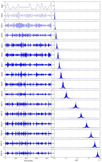 The IVMD algorithm solves the traditional VMD problem of K selection by calculating the MICyy′ value. The original wind power data are fed into the IVMD model, which is decomposed into K IMFs. Based on the results of MICyy′ corresponding to different values of K as indicated in Figure 4, it can be observed that the value of MICyy′ remains stable and constant for K = 16. The IMFs curve after IVMD decomposition and its corresponding spectrum diagram are shown in Figure 5. By observing the principal frequencies of different IMFs from Figure 5, it can be concluded that the IVMD algorithm proposed in this paper can effectively separate each IMF accurately.