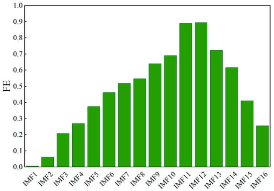 The original wind power data are decomposed into 16 IMFs, and if all the sub-series are directly fed into the prediction model, it will increase the operational burden of the prediction model. Therefore, the complexity of these IMFs will be evaluated by FE, and then the IMFs with similar complexity will be reconstructed into new elements. After conducting extensive experiments, the values of m = 2 and r = 0.25std are found to be the optimal settings for achieving the best accuracy and running time of the model. The FE values of each IMF are shown in Figure 6, and the reconstructed new elements based on these FE values are shown in Table 2.
