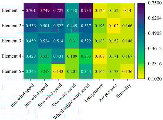The computational efficiency and generalization ability of the model can be improved by removing some irrelevant or redundant features from the original dataset. Therefore, MIC is used to analyze the correlation between meteorological features and each element and extract typical features reflecting each element through MIC value. The confusion matrix of MIC is given in Figure 7. It can be found from Figure 7 that the influence characteristics of each element are different, reflecting the overall correlation and local characteristics, respectively. In order to select the features with the highest relevance to build the input variables, the MIC thresholds of each element are set to 0.5. The input feature selection results are shown in Table 3.