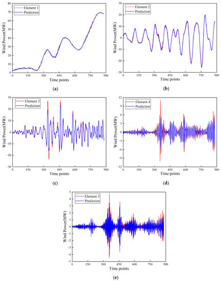 The prediction curve results of each sub-mode. (a) Element 1 prediction curve; (b) Element 2 prediction curve; (c) Element 3 prediction curve; (d) Element 4 prediction curve; (e) Element 5 prediction curve.