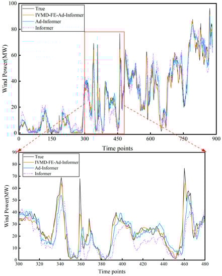 The purpose of conducting ablation experiments is to verify whether the complex hybrid model has improved the prediction accuracy as compared to simple combinatorial models and single models. The selected benchmark models are IVMD-FE-Ad-Informer, Ad-Informer, and Informer, of which the Informer model uses the MSE loss function. The parameters of AD-Informer are obtained using the grid search method, where the robustness parameter β is adaptively adjusted using the Adam optimizer. The specific parameters are shown in Table 4. The input size of the encoder and decoder is equal to the number of input variables of the model. The prediction curve results of each sub-mode after the training of the IVMD-FE-Ad-Informer model are shown in Figure 8, and the wind power prediction results can be obtained by superimposing them. The final forecasting curves of the ablation experiment are shown in Figure 9, and forecasting errors are shown in Table 5. Figure 9 not only portrays the overall trend of the test set but also amplifies the values from position 300 to 480 in order to offer an in-depth analysis of the predicted results. The main reason is that the wind power data within the test set from the 300th to the 480th position displays more sudden changes and a wider range of variation, thus providing a more comprehensive evaluation of the predictive performance of the proposed model.