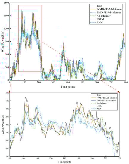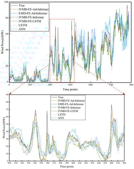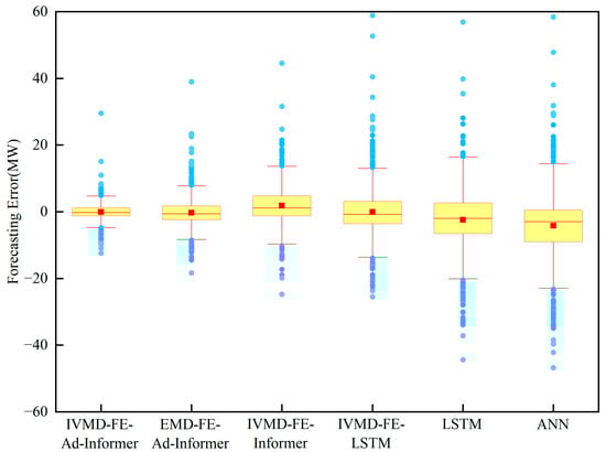 To verify the superiority of each module, EMD-FE-Ad-Informer, IVMD-FE-Informer, IVMD-FE-LSTM, LSTM, and ANN are used as benchmark models in the comparison experiments, and the parameter settings of ANN and LSTM are the same as [,]. EMD decomposes wind power data into 11 IMFs by trail-and-error method, and then these IMFs are reconstructed into three new components (IMF1~IMF3, IMF4~IMF6, and IMF7~IMF11) using FE. The forecasting curves of different models are shown in Figure 10. The forecasting errors are shown in Table 6. The boxplots of the forecasting errors for each model are given in Figure 11.