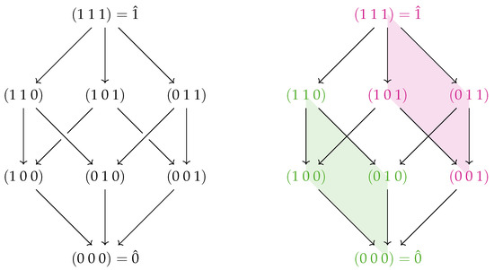 Figure 2, two faces of the three-variable lattice are shaded. The green region corresponds to the 2-point interaction between the first two variables. The red region contains a similar interaction between the first two variables, except this time in the context of the third variable fixed to 1 instead of 0. This illustrates the interpretation of a 3-point interaction as the difference in two 2-point interactions (