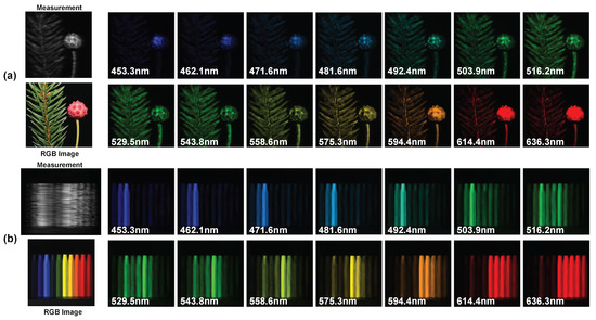 Figure A11, Figure A12, Figure A13 and Figure A14 show the RGB images, measurements and the reconstructed 28 spectral channels for four real scenes with a size of 660 × 660 pixels captured by real CASSI system.