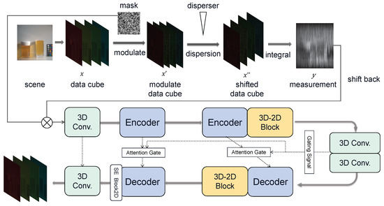 where denotes the measurement noise. To facilitate the description of the model, the coding process could be considered as modulating with a shifted mask corresponding to different wavelengths and the liner dispersion d, i.e., . Correspondingly, the shifted version of the original data-cube is . According to this, the 2D measurement can be modeled as