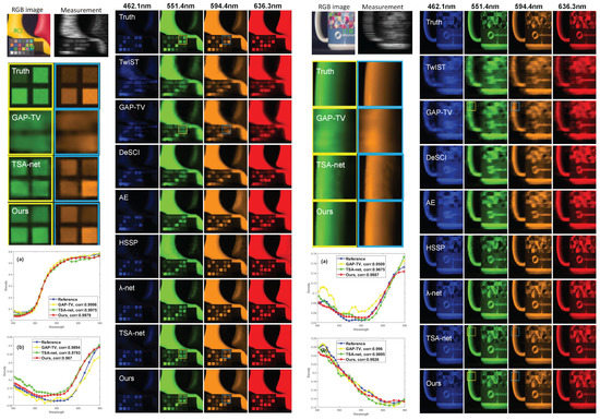 Two reconstructed scenes with four spectral channels using seven methods. We compare the recovered spectra of the selected region (shown with a, b on the RGB images) and spatial details. box “a” and box “b” have been chosen to perform correlation analysis.