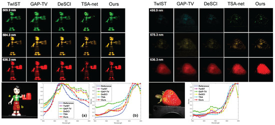 The reconstruction results of two scenes, Lego and Strawberry are shown in Figure 4, where we plot four reconstructed frames at different wavelengths and spectral density curves to demonstrate the performance of our proposed method. We observe that our result contains more detail in Legoman’s face area because our model produces sharper edges than other models. In the Strawberry testcase, our result has higher spatial resolution in all selected wavelengths. Similar to Figure 3, we attached a visualization of numerical assessment in Figure 4 and the method to obtain such assessment is the same as described above. We observe that our curve (red) is closest to the reference curve (blue) among all other curves.wo more real data results of Plants and Legoplants are shown in Figure 1 and Figure 5 with 14 and 7 selected reconstructed channels, respectively. We selected 7 spectral channels out of 28 as shown in Figure 5. Our model achieves superior reconstruction results in terms of clarity and aesthetics compared to TSA-net. Specifically, our model produces more pointed edges that elevate the overall reconstruction quality.s shown in the plots, our method provides sharper edges and more spacial details such as the hands and clothes of the Lego man. The spectral density curves reveal our method is closer to the ground truth as well.