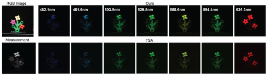 Real data: The RGB references and result images of a real measurement for 7 out of 28 spectral channels reconstructed via TSA and our proposed method.