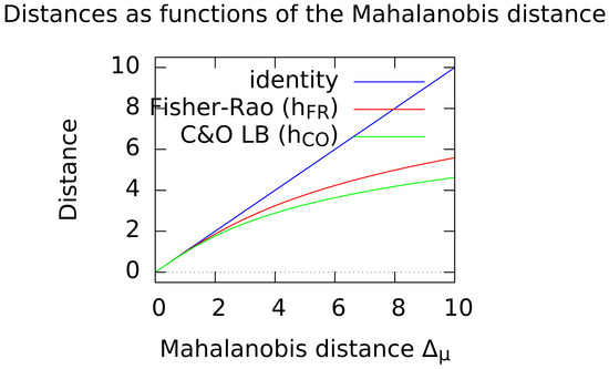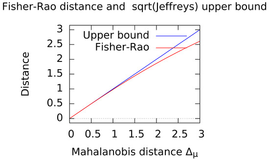 - In the univariate case , the Fisher–Rao distance between and can be derived from the hyperbolic distance [44] expressed in the Poincaré upper space since we havewhere and . It follows thatThus, we have the following expression for the Fisher–Rao distance between univariate normal distributions:withIn particular, we have