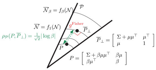 In 1D, the affine-invariance property (Property 1) extends to function as follows:Using one of the many identities between inverse hyperbolic functions (e.g., arctanh, arccosh, arcsinh), we can obtain an equivalent formula for Equation (7). For example, since for , we have equivalently:The Fisher–Rao geodesics are semi-ellipses with centers located on the x-axis. See Appendix A.1 for the parametric equations of Fisher–Rao geodesics between univariate normal distributions. Figure 1 displays four univariate normal distributions with their pairwise geodesics and Fisher–Rao distances.Using the identity with , we also haveSince the inverse hyperbolic cosecant (CSC) function is defined by , we further obtainWe can also writeThus, using the many-conversions formula between inverse hyperbolic functions, we obtain many equivalent different formulas of the Fisher–Rao distance, which are used in the literature. - In the second case, the Fisher–Rao distance between and has been reported in [6,7,45,46,47]:where denotes the i-th generalized largest eigenvalue of matrix M, where the generalized eigenvalues are solutions of the equation . Let us notice that since and . Matrix may not be SPD and thus the ’s are generalized eigenvalues. We may consider instead the SPD matrix which is SPD and such that . The Fisher–Rao distance of Equation (11) can be equivalently written [48] aswhere is the matrix logarithm (unique when M is SPD) and is the matrix Fröbenius norm. This metric distance between SPD matrices although first studied by Siegel [45] in 1964 was rediscovered and analyzed recently in [49] (2003). Let so that .The Riemannian SPD distance enjoys the following well-known invariance properties: