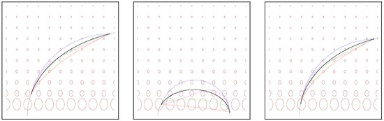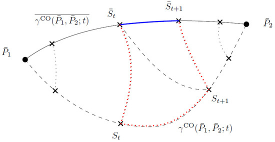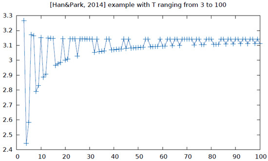 - We use the following example of Han and Park [39] (Equation (26)):Their geodesic shooting algorithm [39] evaluates the Fisher–Rao distance to (precision ).We obtain:In that setting, the upper bound is better than the upper bound of Equation (35), and the projected Calvo and Oller geodesic yields the best approximation of the Fisher–Rao distance (Figure 15) with an absolute error of (about relative error). When , we have , when , we obtain , and when we obtain (which is better than the approximation obtained for ). Figure 16 shows the fluctuations of the approximation of the Fisher–Rao distance by the projected C&O curve when T ranges from 3 to 100.