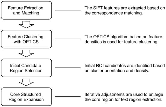 This paper presents a structured region detection approach based on the distillation of local image features with clustering analysis. We are focused on the extraction of structured clusters from local feature learning. Thus, the objective is not for a general character recognition task. Figure 1 depicts the system flow of the proposed technique. The features in the target image corresponding to the similar structures in the reference images are first extracted, followed by region detection from analysis of the clustering characteristics of the ordered feature points. In our proposed method, the images with multiple characters in the database are used for feature matching. It is able to detect the text clusters under the sparsity of feature points derived from some characters. The location with high feature density is selected as a candidate, and an iterative process is carried out to increase the ROIs for the derivation of some suitable region with structured content. Since fast detection using limited computational resources is the key to the success of real-world applications, it is desirable to reduce the costs of model training and online inference. Different from existing deep neural network approaches, our technique can be easily implemented with hardware-oriented acceleration [,]. In the experiments, the text detection and recognition of invoice and banknote have demonstrated the effectiveness of the proposed technique.