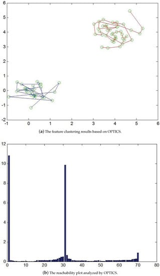 In general, it is required that good parameter settings be provided for clustering analysis algorithms []. However, it is not generally the case that there is an internal data structure that can be described clearly using a set of global parameters. The proper parameters are not only difficult to derive but also sensitive to the clustering results. In this work, we present a hierarchical clustering technique for feature aggregation based on the OPTICS (ordering points to identify the clustering structure) algorithm []. It does not directly perform the clustering but provides a feature sorting scheme to represent the data. Based on the ordering of reachability distances associated with the feature density, a reachability plot is generated and used for cluster identification. Through the analysis of cluster densities, it is possible to maintain stable feature structures using a wide range of parameters. Figure 4 illustrates a typical example of OPTICS clustering. Two sets of dense feature points located on the corners are shown in Figure 4a. The reachability plot as depicted in Figure 4b indicates the two flat regions in the intervals and are associated with two clusters in Figure 4a. In other words, the peak at around 31 indicates the density-based distance is large and can be adopted for the cluster derivation.