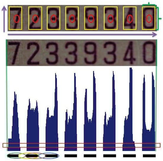 In the implementation, the vertical projection of the region of interest is used to derive the histogram of character pixels as shown in Figure 6. Let the widths of character and letter-spacing be denoted by and , for and , respectively. N is the total number of characters. To increase the robustness of pattern matching, a series of width ratios derived from the neighboring character and letter-spacing is used. That is, a feature vector coded by