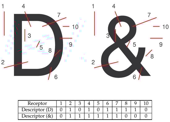 Two examples of the descriptors derived with 10 receptors applied on the characters ‘D’ and ‘&’. The values 1 and 0 in the table indicate the presence of intersection with the character.