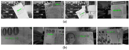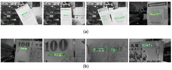 In the first-stage results, the SIFT features are extracted based on the correspondence matching with the reference dataset images. The green circles marked in the images indicate the feature point extraction for (a) an invoice and (b) a banknote.