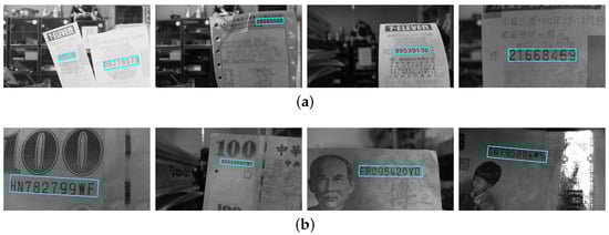 The technical process for identification of invoice information shares similarities with that of banknote recognition in pattern structure detection. However, the extraction of invoice numbers is usually more complicated due to the variation of background texture. To identify invoice information, Sun et al. proposed a template-based method for region detection []. Optical character recognition is then carried out to retrieve the text information. Tian et al. developed an iterative self-learning framework for intelligent financial ticket recognition []. A network model was constructed based on Faster R-CNN to recognize multiple ticket formats. In their work [], Jiang et al. proposed a unified framework to process and recognize VAT invoices. The end-to-end model was trained to handle challenging cases with multi-oriented texts.