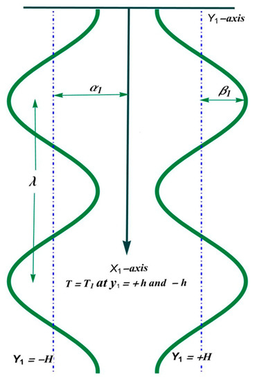 A 2D incompressible peristaltic transport of an electrically conducting pattern of hybrid nanoparticles , due to a symmetric channel having width ‘’, is considered. The sinusoidal waves propagate with a wavelength of along its walls at constant wave speed . Here, the Cartesian coordinates (, ) are employed, and are reserved along the perpendicular and parallel to the middle line, respectively (see Figure 1).